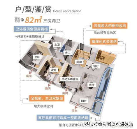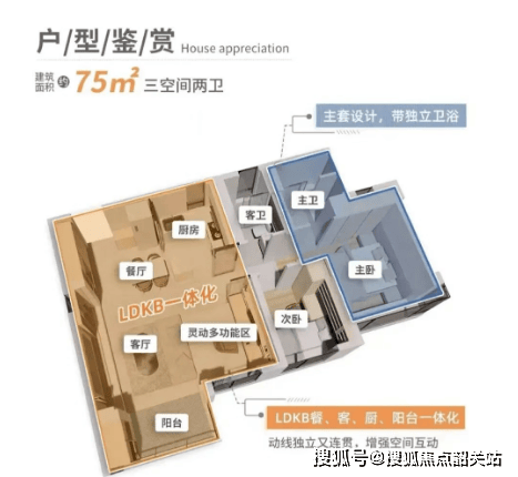 二、户型设计亮点:95% 高实用率,75㎡做三房两卫