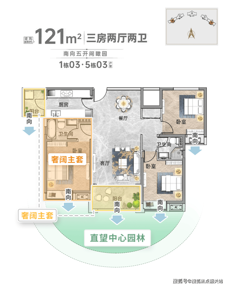 121平米三房:五开间朝南,奢阔主套带南向大飘窗和独立卫浴,私密性强,双阳台设计兼顾观景和生活需求。