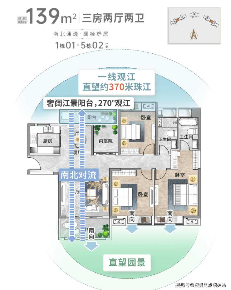 130平米3+1房:南北双阳台,通风对流良好,三开间直望一线江景,南向约4.1米宽景阳台可俯瞰满园葱翠。