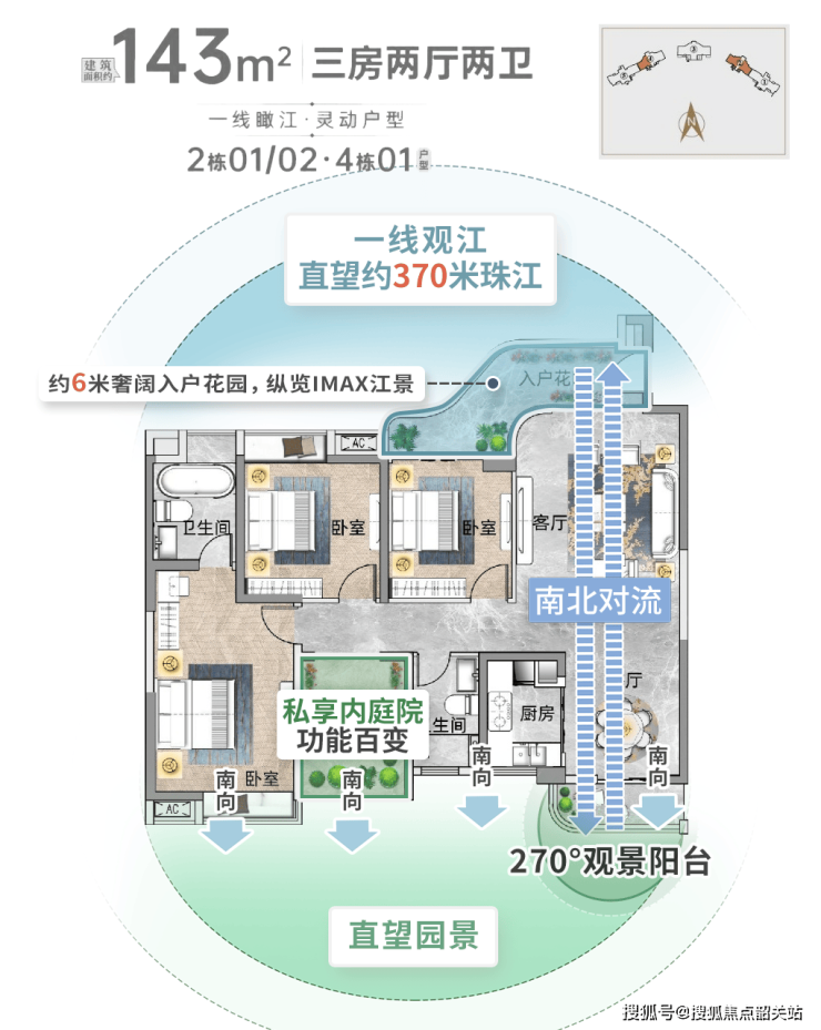 143平米、162平米3+1房:均配有约6米奢阔观景阳台,客厅采用270°转角设计,最大程度引江景入室,南向亦有270°观景阳台。
