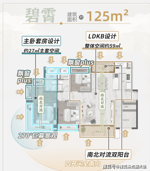 首先是建筑面积约125㎡的“碧管”户型。该户型做到了南北对流双阳台设计,LDKB(客餐厨阳)整体空间高达约59㎡,视野开阔,采光极佳。四开间全南向的布局,让阳光洒满每一个角落。超27㎡的主套空间,配备了独立卫浴,私密性与舒适度兼得。
