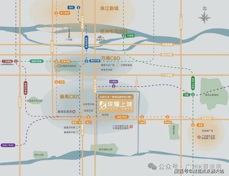 距项目2站的番禺广场,番禺区府所在地,集合番禺的行政、交通、教育、医疗、文化中心,是与北万博平齐的番禺南中心。