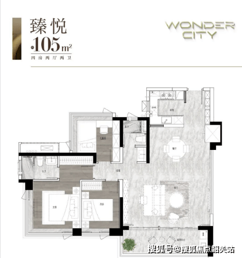 第一款主力户型为二期超新规建面约105㎡四房两厅两卫,定位为“CBD绝版超新规高拓四房”,精准匹配三口之家、四口之家或二孩家庭,是广州改善市场的爆款户型,使用率超120%,实际使用面积超130㎡,空间宽敞明亮、布局方正合理,每一处空间都彰显着高拓优势与高端品质,是项目的核心热销户型之一。该户型采用纯南向设计,南向面宽达12米,全屋全明采光、通风极佳,推窗即可欣赏社区园林景观,将自然诗意融入日常生活。户型整体得房率超高,无浪费空间,每一处空间都得到合理利用,兼顾实用性与高端舒适度,完美契合改善型家庭的居住需求,同等面积段产品中,空间尺度、房间数量遥遥领先。