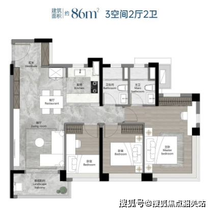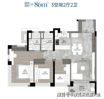 88平方米三房两厅两卫:采用蝶式布局,四开间朝南,提供极高的居住舒适度。