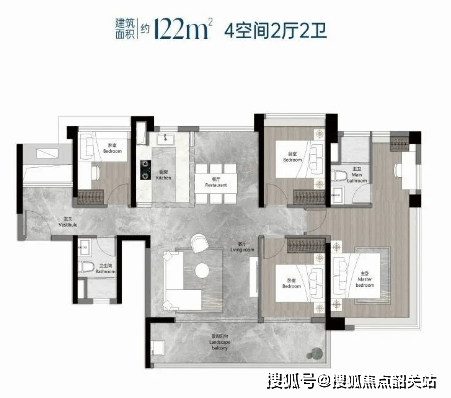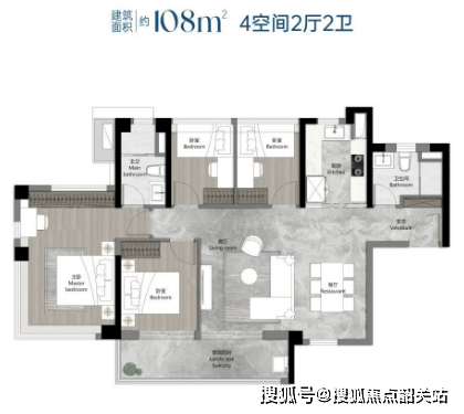 108平方米四房两厅两卫:横厅设计,阳台开间达到5.95米,客餐厅进深约4.4米,拥有宽敞明亮的公共区域。