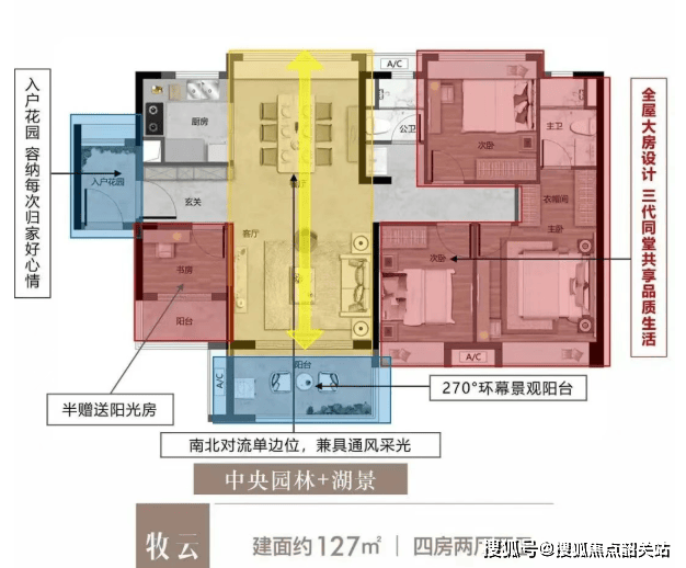 127㎡四房两卫:入户花园+双厅设计,四开间朝南,彰显尊贵格调;