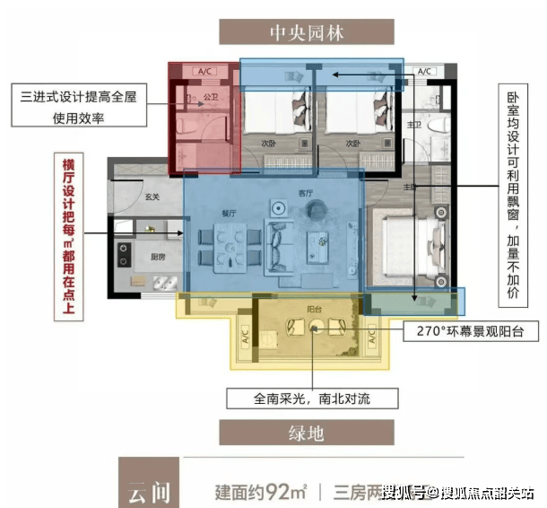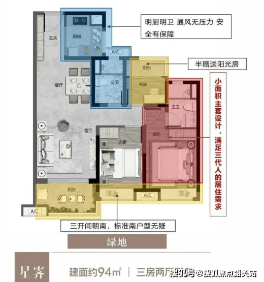 92㎡/94㎡三房两卫:南北通透,三开间朝南,部分单位带半赠送阳光房,实用率高;