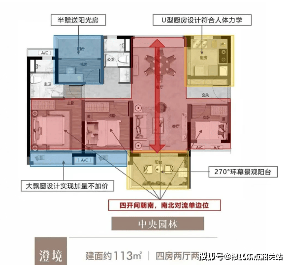 111㎡/113㎡四房两卫:270°环幕阳台,动静分区明确,主卧带超大南向湖景视野;