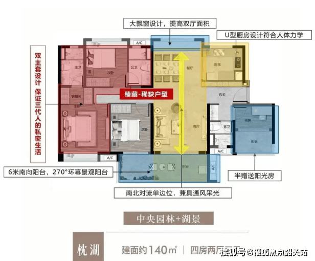 140㎡四房三卫:双主套配置,6米南向阳台,奢享湖景与城市天际线双重景观。