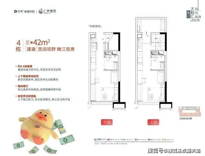 项目主力户型为建面约30–42㎡的复式产品,虽面积紧凑,但凭借约4.5米的层高,通过结构优化实现上下两层空间分隔。下层可规划为开放式客厅、厨房及卫生间,满足日常起居与社交需求;上层则设为卧室或私密休息区,保障睡眠安静。尤为特别的是,上下层均设有独立入户门,采用“双钥匙”管理模式——这意味着业主可将一层用于自住,另一层出租;或一层办公、一层居住;甚至同时租给两位租客,实现收益最大化。这种灵活的空间组织方式,在广州主城区小户型产品中较为少见,尤其契合自由职业者、初创团队或资产轻配置人群的实际需求。