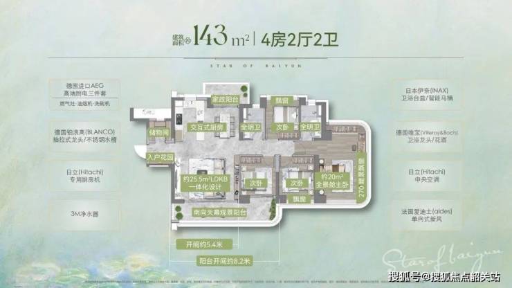 宽境奢宅:迭代新规户型,超100%实用率,约3.1-3.3米层高,南北通透双阳台,LDKB-X百变交互场景,主卧270°宽幕飘窗(部分户型)。