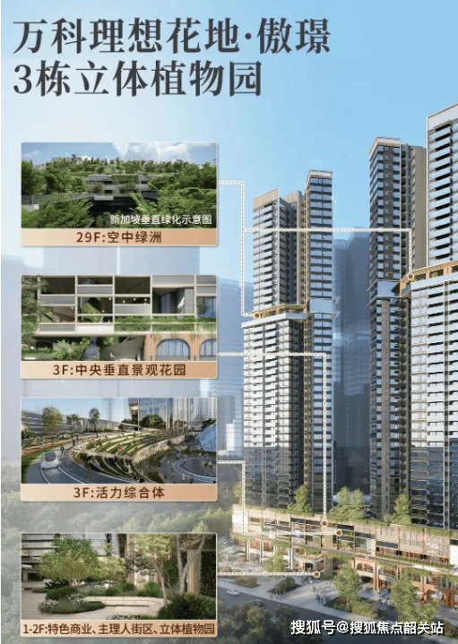 社区内更打造广州首座立体植物园住宅,1–2层为商业+垂直绿化,3层设体育会所(含泳池、健身房、球类场地),30层设空中会所,实现“垂直森林+立体生活”理念。