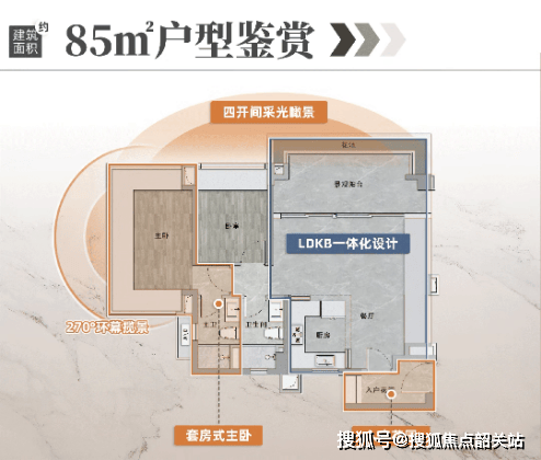 85㎡三房:南向大面宽+入户花园,赠送面积多,为使用率最高户型之一;