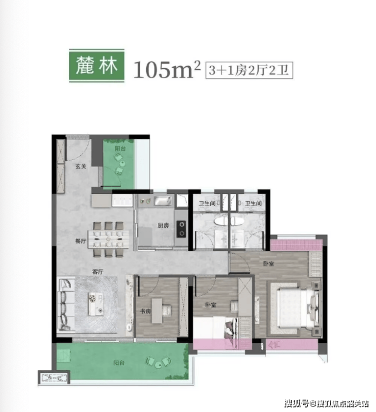 约105㎡舒适四房:以“科学城最低总价四房”为卖点,满足多孩家庭或需要独立书房、父母同住家庭的成长性需求,功能性强,性价比极高。
