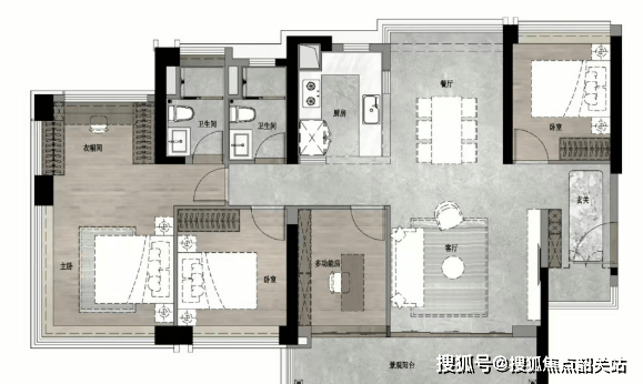 105平米四房两厅两卫:五开间朝南,南北对流通风良好;餐厅中心化设计,开放式厨房与餐桌互动,兼顾烹饪与交流;双面宽大阳台,兼顾家政和休闲功能。