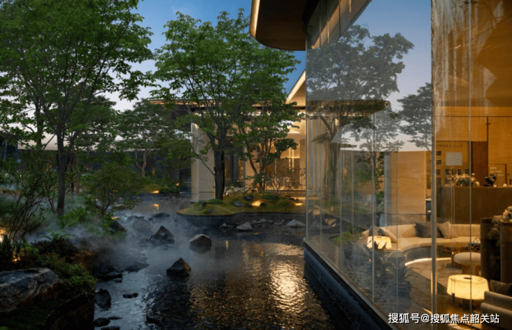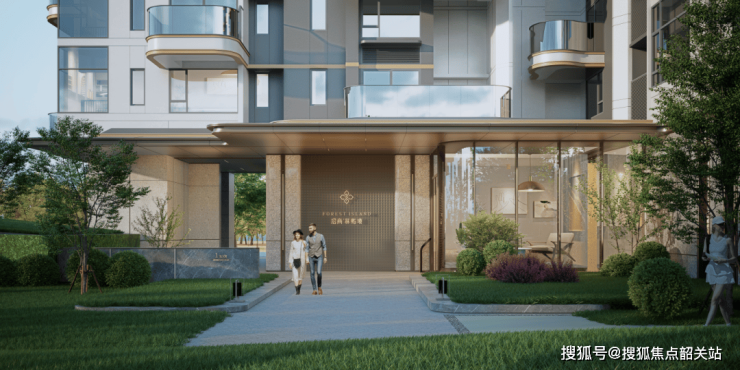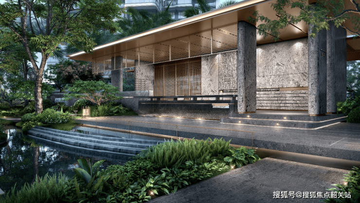 森屿门庭--高定精工崇礼之门,约49.7米宽入口门楼界面,约7.3米高社区主入口,打造尊崇的第一道酒店式归家仪式,显赫而归,入口门庭以港湾式落客打造界面,以精致的奢石材料设置仪式景墙,搭配造型优美的景观树,悬浮感的入口水景营造出“从城市浪潮驶入私域绿洲”的仪式感。