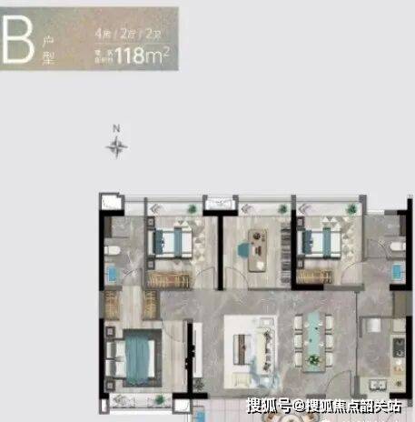 B户型:建面约118㎡3+1房两厅两卫