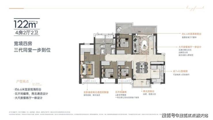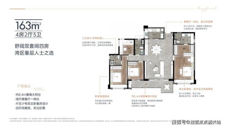 滨海院墅建筑面积约300-450㎡,低密度布局,保障居住私密性和通风采光;海景大平层建筑面积约220-256㎡,头排观景位设计,让湾海成为日常生活的主角。住宅设计兼顾功能与美学,通过大开间、转角飘窗、双阳台等设计,使生活空间舒适宽敞,满足高端家庭对居住品质的要求。