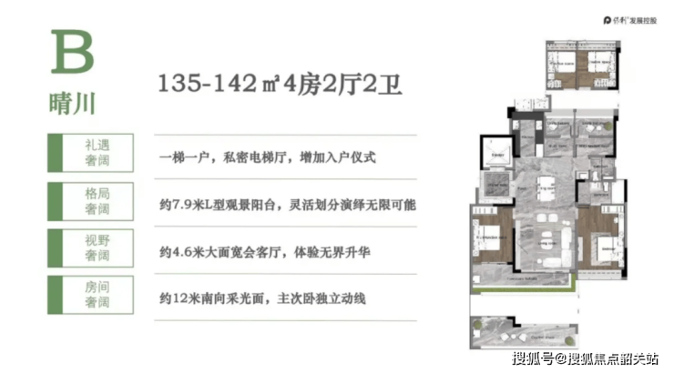 134-142㎡四房两厅两卫总价870-925万,超尺度阳台连通次卧,部分户型可享景观视野