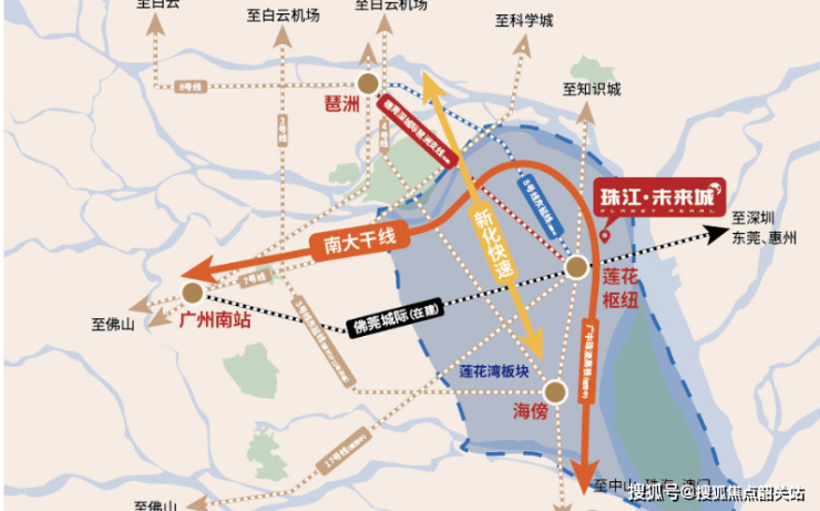 4. 珠江未来城周边地铁线路规划完善,各类交通方式织成网络,往来湾区有了全新畅快体验。项目临近规划中的地铁8号线东延线莲花山站与17号线,未来双地铁加持,可实现3站到琶洲CBD、万博CBD,4站到广州南站;区域内还有佛莞城轨(在建)、穗莞深城轨琶洲支线(在建)、广中珠澳高铁(规划)三城轨,进一步拓展了交通辐射范围。自驾方面,南大干线连接穗佛莞6大城市商务区,新化快速约25分钟直达天河,公交路网也有多条线路覆盖。这种多维度的交通网络,让往来湾区各地无论是通勤还是出行都十分便捷,为居住和经商在此的人们提供了高效的交通保障。