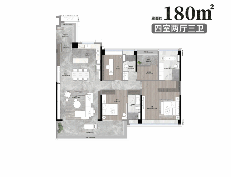 空间,是生活方式的载体,更是家庭情感的容器。越秀·天河·和樾府深刻理解改善型家庭对空间尺度、功能性与舒适度的全面追求,纯粹规划建面约125至180㎡的板式大宅。社区采用围合式布局,形成近百米的超阔楼间距,不仅保证了每一户的极致采光、通风与视野,更将充足的空间归还给园林与绿地,营造出开阔、疏朗的社区气场。所有楼栋均采用板式设计,实现极高的实用率,确保每一平方米都物尽其用。户型设计方正通透,注重全明格局与动静分区,南向大面宽设计将阳光与园林景致最大限度地引入室内。我们通过创新的空间规划,实现LDKB一体化方厅、独立玄关、豪华主卧套房、多功能房等配置,满足多代同堂家庭的多样化生活场景。从满足品质改善需求的舒适四房,到彰显世家气度的阔绰五房,天河和樾府以极高的空间效率与人性化细节,为广州菁英家庭提供了一个能够伴随家族成长、安放所有温馨时光的梦想家园。