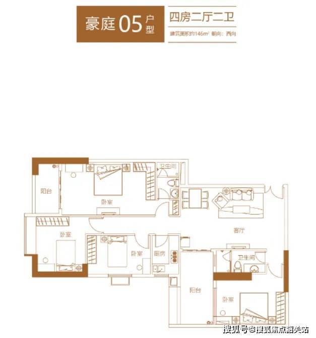 建面约146㎡户型,豪华四房带双阳台设计。三代同堂也享有阔绰的空间,一点都不显拥挤。