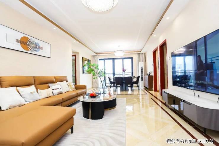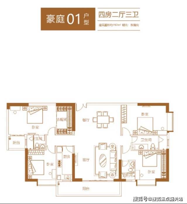 再看建面约192㎡东南向双主套四房,空间阔绰感简直不要太满。餐客厅与阳台直通,大气奢阔,采光通风一流,即便是举办一场多人的party也不在话下。